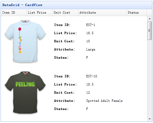 <table id="tt" style="width:500px;height:400px" title="DataGrid - CardView" singleSelect="true" fitColumns="true" remoteSort="false" url="datagrid8_getdata.php" pagination="true" sortOrder="desc" sortName="itemid"> <thead> <tr> <th field="itemid" width="80" sortable="true">Item ID</th> <th field="listprice" width="80" sortable="true">List Price</th> <th field="unitcost" width="80" sortable="true">Unit Cost</th> <th field="attr1" width="150" sortable="true">Attribute</th> <th field="status" width="60" sortable="true">Status</th> </tr> </thead> </table>
