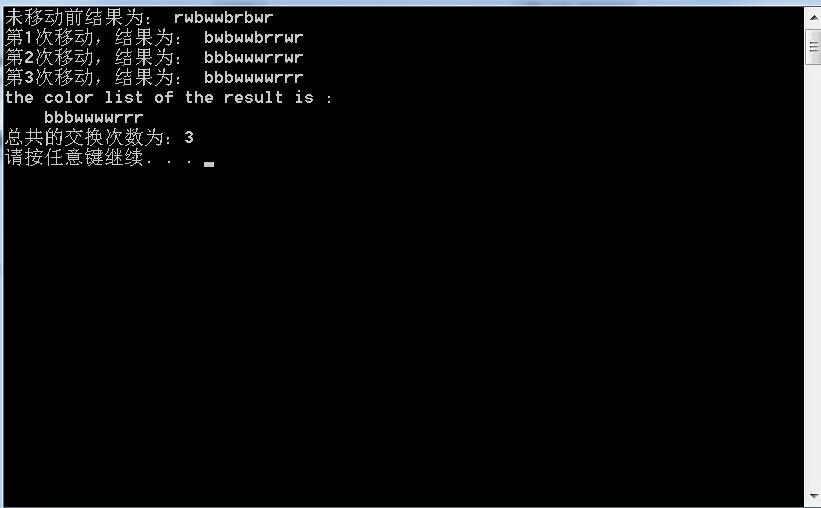 注意观察打印出来的结果,可以发现有一些冗余的移动,导致移动次数比较大改进的解法如下:进行两趟遍历,首先对于成对的顺序相反的红色和蓝色旗子,交互其位置其次对前后的蓝色和红色旗帜进行整理,使其聚集到一起