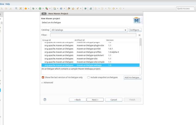 然后点击"Next",注意接下来选择的"Archetype",咱们是 Web 项目,所以一定要选择"maven-archetype-webapp",如下图:
