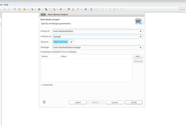 然后点击"Next",填写 Group Id 和 Artifact Id,然后在点击"Finish"。