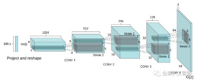 第三篇文章,简称(DCGAN),在实际中是代码使用率最高的一篇文章,本系列文的代码也是这篇文章代码的初级版本,它优化了网络结构,加入了 conv,batch_norm 等层,使得网络更容易训练,网络结构如下:
