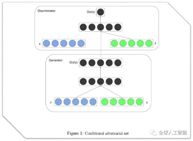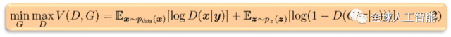 第二篇文章想法很简单,就是给 GAN 加上条件,让生成的样本符合我们的预期,这个条件可以是类别标签(例如 MNIST 手写数据集的类别标签),也可以是其他的多模态信息(例如对图像的描述语言)等。用公式表示就是: