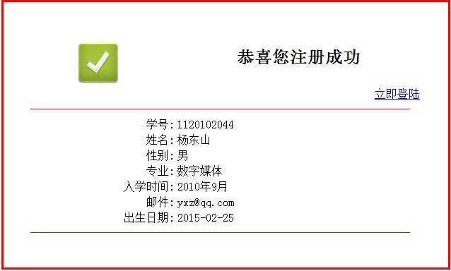 JavaScript包括学号、姓名、密码长度、性别等判断,同时register_sresult.php显示结果代码如下,数据库方面是封装在类中,调用下面代码实现的: